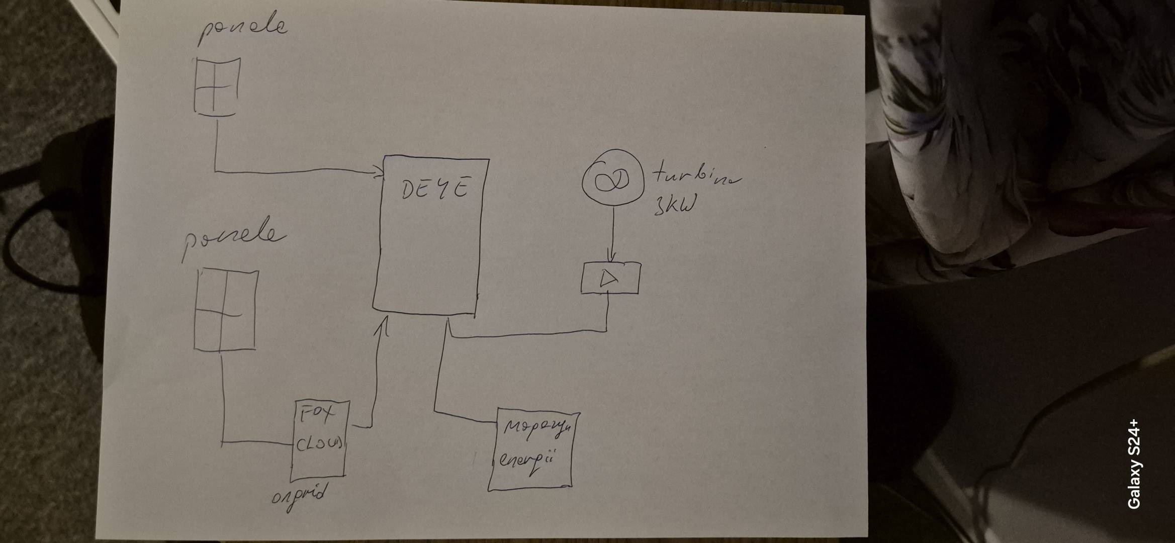Mam obecnie falownik ONGRID FOXCLOUD i jest on podłączony do drugiego falownika OFFGRID DEYE. Do tego falownika tzn. deye podłączony jest również drugi zestaw paneli fotowoltaicznych magazyn energii a do magazynu energii równolegle podłączona jest turbina 3kW.